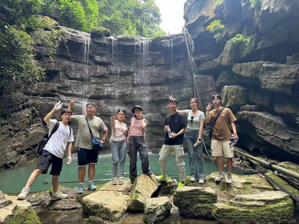 抵达古丈县后,“走近湘西”暑期实践团首先前往坐龙峡景区,深切体验这片神秘而古老的土地所散发的迷人魅力。漫步在峡谷中,仿佛能感受到岁月的深沉和历史的厚重。坐龙峡因其壮丽的自然景观和悠久的人文历史而被誉为“中南第一奇峡”,这个美誉完全名副其实。站在峡谷之中,岩壁上悬挂的苔藓和瀑布间飞溅的水珠,无不展现出大自然的鬼斧神工。